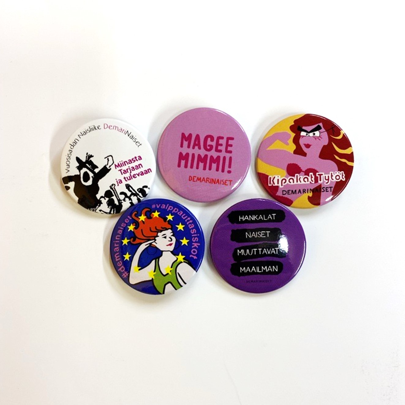 Viittä erilaista pinssiä yhteensä 100kpl pussissa.